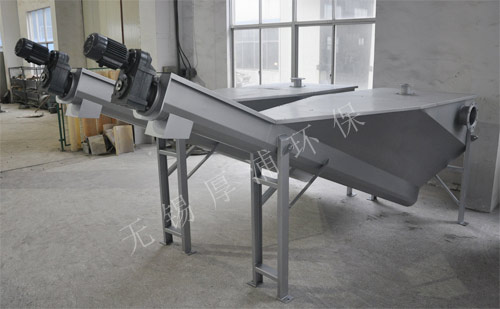砂水分離器設(shè)備一般螺旋傾角為25~30°之間,砂水混合液從進水管進入本設(shè)備,混合液通過分離機上部的聚集箱,在水流的作用下,使混合液的砂粒與有機物進行分離,砂水進入集砂槽中,比重較大的顆粒(如砂粒)由于自重而下降,沉積于螺旋槽底部,在螺旋葉片的推動下,物料沿斜置的U型槽底部提升,離開液面后,繼續(xù)上移一段距離,砂粒中的水分逐漸在螺旋槽葉片的空隙中流回水箱,砂粒液逐漸干化到出料口處,依靠自重落入其他輸送裝置中,上清液則不斷從排水堰溢流出去,有機物在水流漩渦的作用下,也跟著上清液從溢流槽流出,回流至污水井中,從而達到砂水分離的作用。