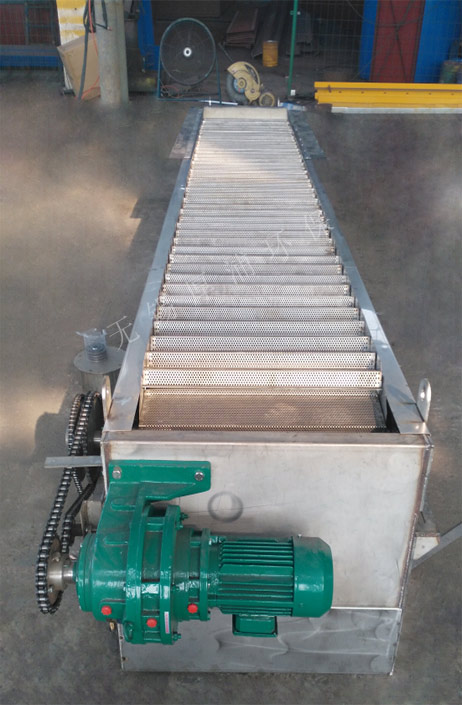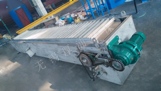 網(wǎng)板式階梯格柵機的驅(qū)動裝置位于機架上部,除傳動裝置外,其余均采用不銹鋼材料制造。驅(qū)動裝置采用軸裝式減速機,在機架二側(cè)設(shè)置螺旋式調(diào)節(jié)裝置,以作調(diào)整傳動鏈條張緊用。