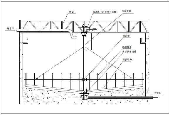 含有細粒物體的料漿或污水,經槽架或污泥管給入濃縮池的中心部位,料漿做均勻輻射狀向周邊緩慢流動,在溫游中料漿或污水中的固體顆粒籍自重或絮凝作用而沉降。由于濃度較低,顆?;咀鲎杂谐两?,沉速較快,繼而沉入濃集帶,沉速較慢。沉到下部一沉積帶,也是濃度較高的壓縮區(qū),水分從沉降顆粒的間隙中不斷析出。中耙架連續(xù)回轉時,耙齒對該部沉積物沿池底的錐形坡面逐級推向池底的中心處,由該處的排料口排出。中耙齒推進沉積物時,也是刮板對沉積物的一個壓縮過程,這也大大的促使析水作用的加強,因而從排料口排出的沉積物時經過濃縮的料漿或污泥。池上部是澄清帶,澄清液從池邊溢流堰排出,從而構成濃縮機工作的全過程。
