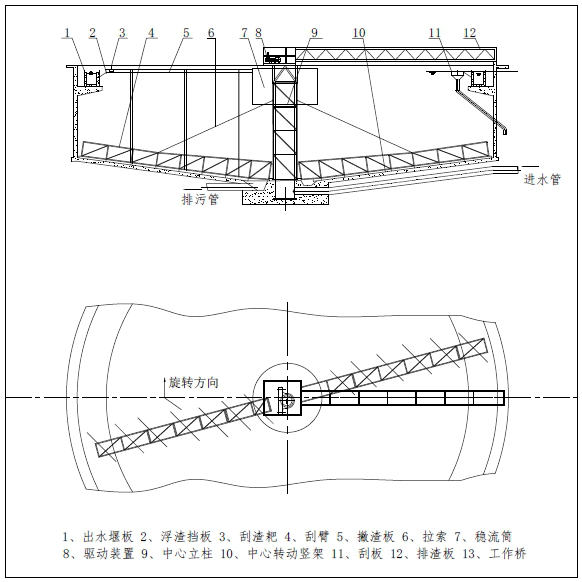 該設(shè)備采用中心傳動、垂架式,污水從進水管流入導(dǎo)流筒擴散后,均勻的向周邊呈輻射狀流出,呈懸浮狀的污泥經(jīng)沉淀后沉積于池底,驅(qū)動裝置帶動中心豎架旋轉(zhuǎn),并帶動刮臂及刮泥板轉(zhuǎn)動,將污泥從池周刮向中心集泥槽后,靠池內(nèi)靜水壓由排泥管排出池外。水面的浮渣通過撇渣裝置撇向池邊,再由刮渣耙刮進排渣斗內(nèi)排出池外。而上清液則通過出水堰板溢入出水槽內(nèi)排出。