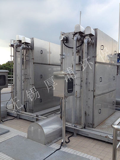內(nèi)進(jìn)流式網(wǎng)板格柵除污機(jī)的機(jī)架為不銹鋼板材與型鋼組裝、焊接成的一整體式長(zhǎng)方體剛性結(jié)構(gòu)。機(jī)架下部迎水端開有一個(gè)進(jìn)水洞口,機(jī)架的前后壁板上設(shè)有導(dǎo)軌,其上部還設(shè)有一內(nèi)部集渣槽,并延伸至機(jī)外。機(jī)架安裝于格柵井的中央,機(jī)架的兩側(cè)與格柵井之間的間隙為格柵濾后出水的通道。在機(jī)架的迎水端兩側(cè)布置了導(dǎo)流擋板,其在導(dǎo)流的同時(shí),可防止漂浮垃圾通過。